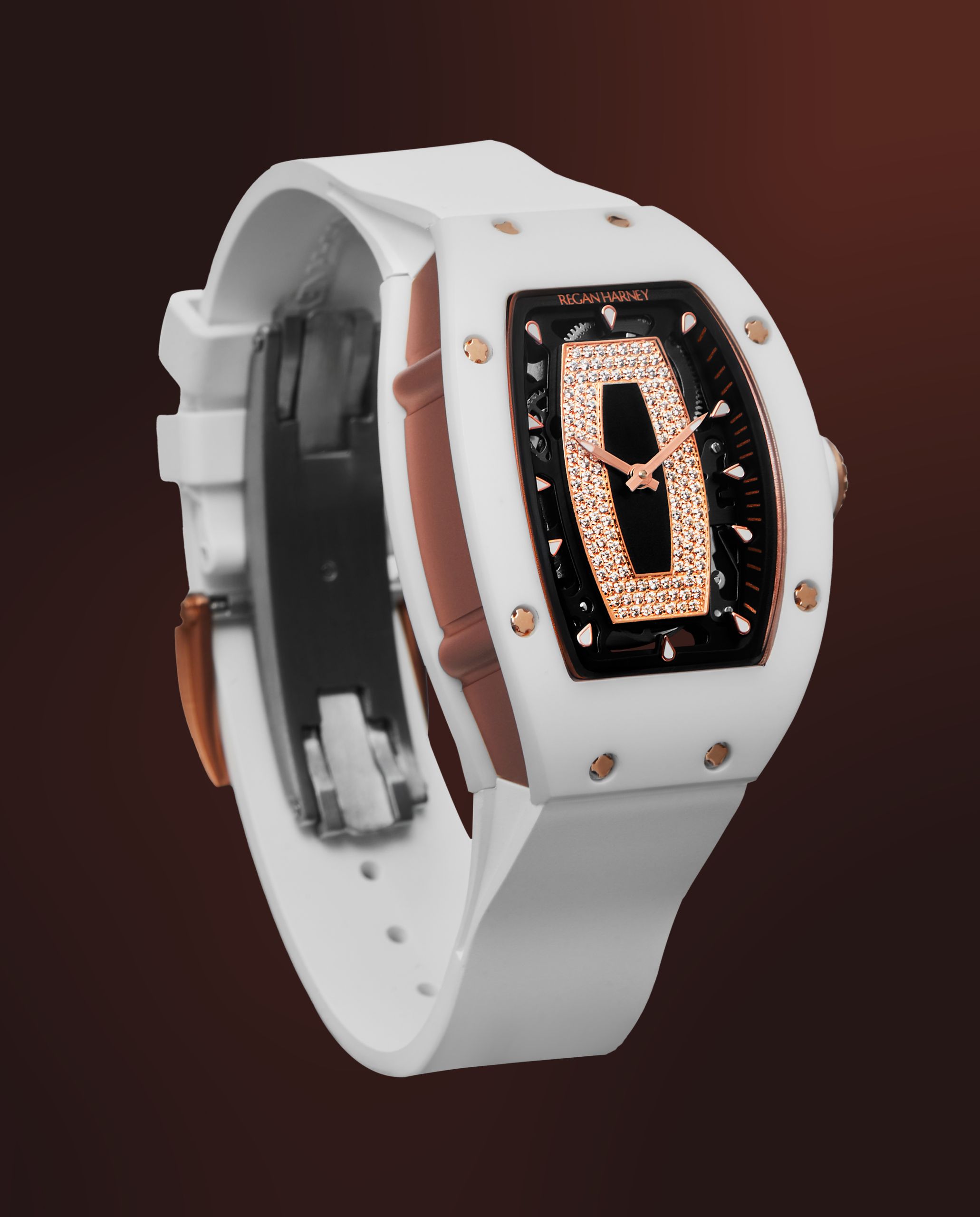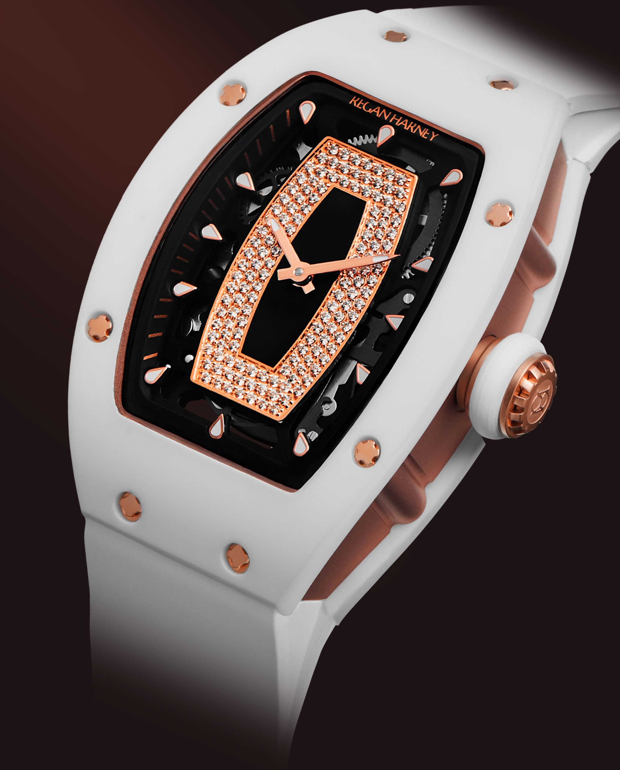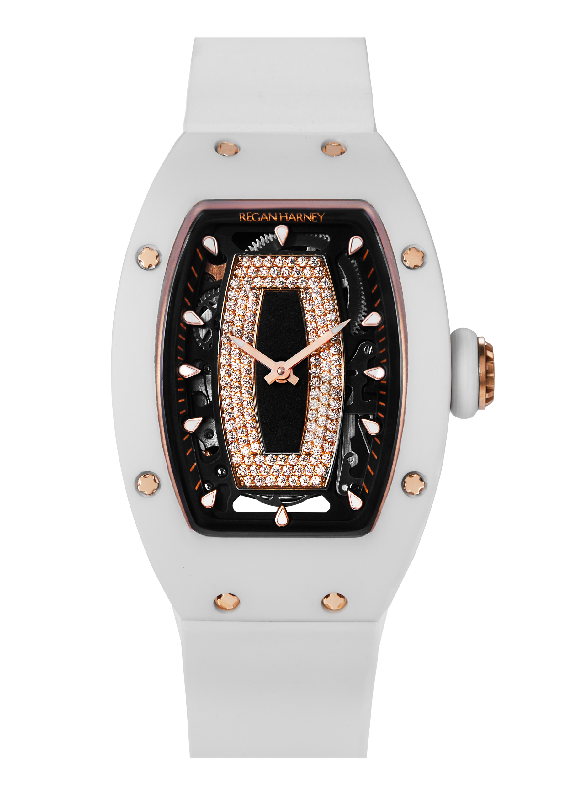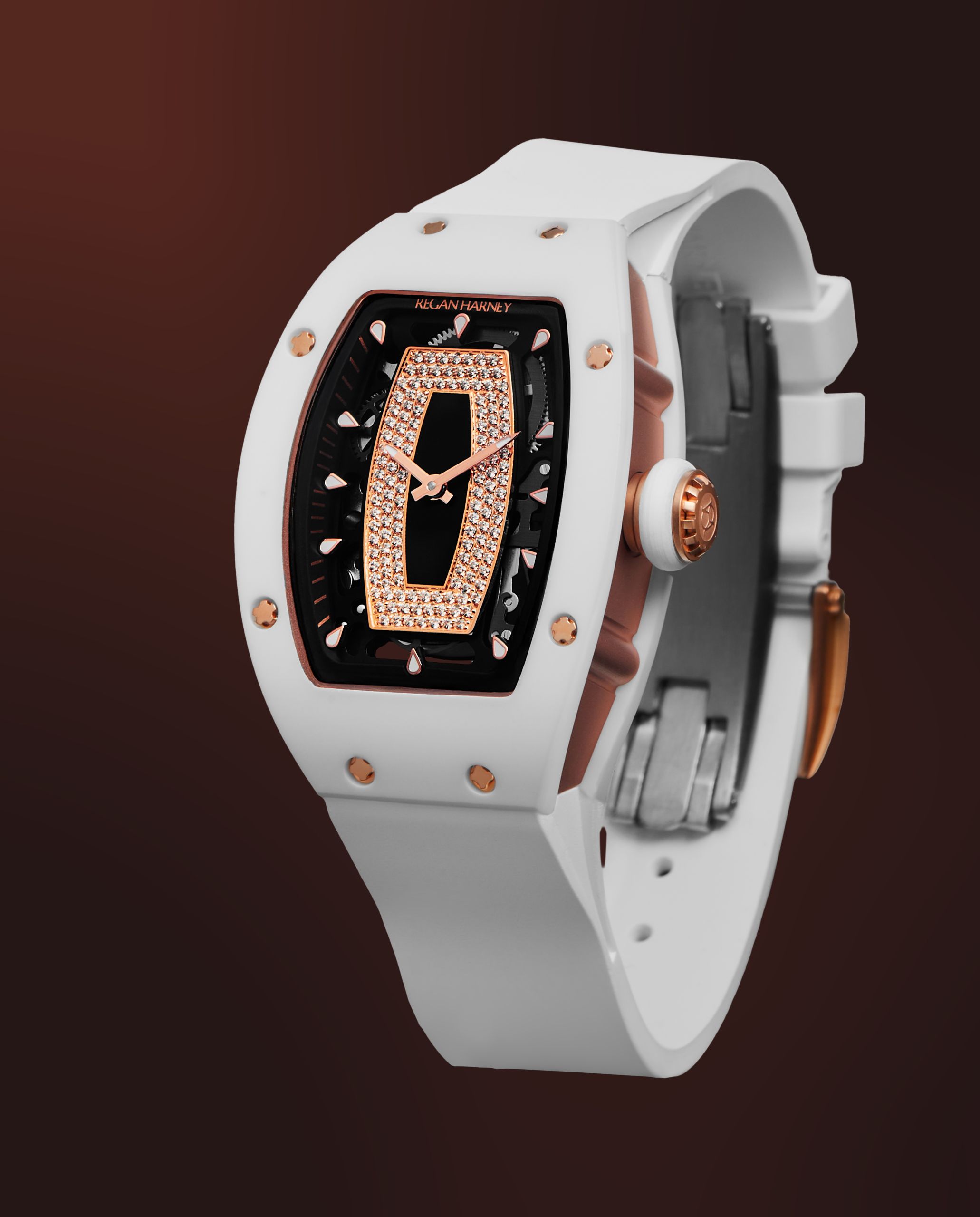 The RH32-11 “The Yang” features a serene and refined design with a pristine white ceramic case enhanced by crystal diamond accents. Powered by a reliable automatic movement, this timepiece combines precision performance with a comfortable vulcanized rubber strap and durable sapphire crystal protection—offering elegant everyday wear with a balanced and graceful aesthetic.