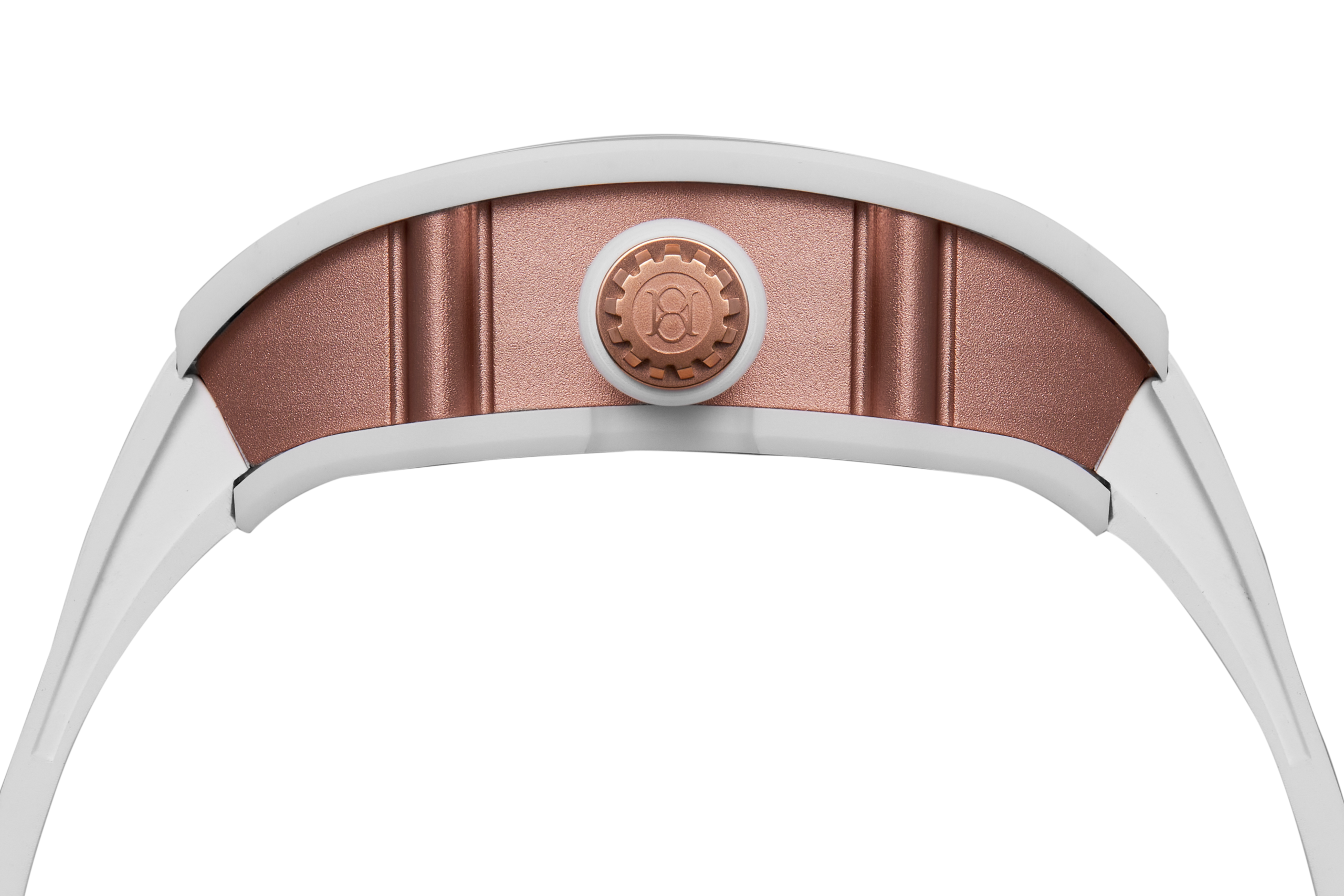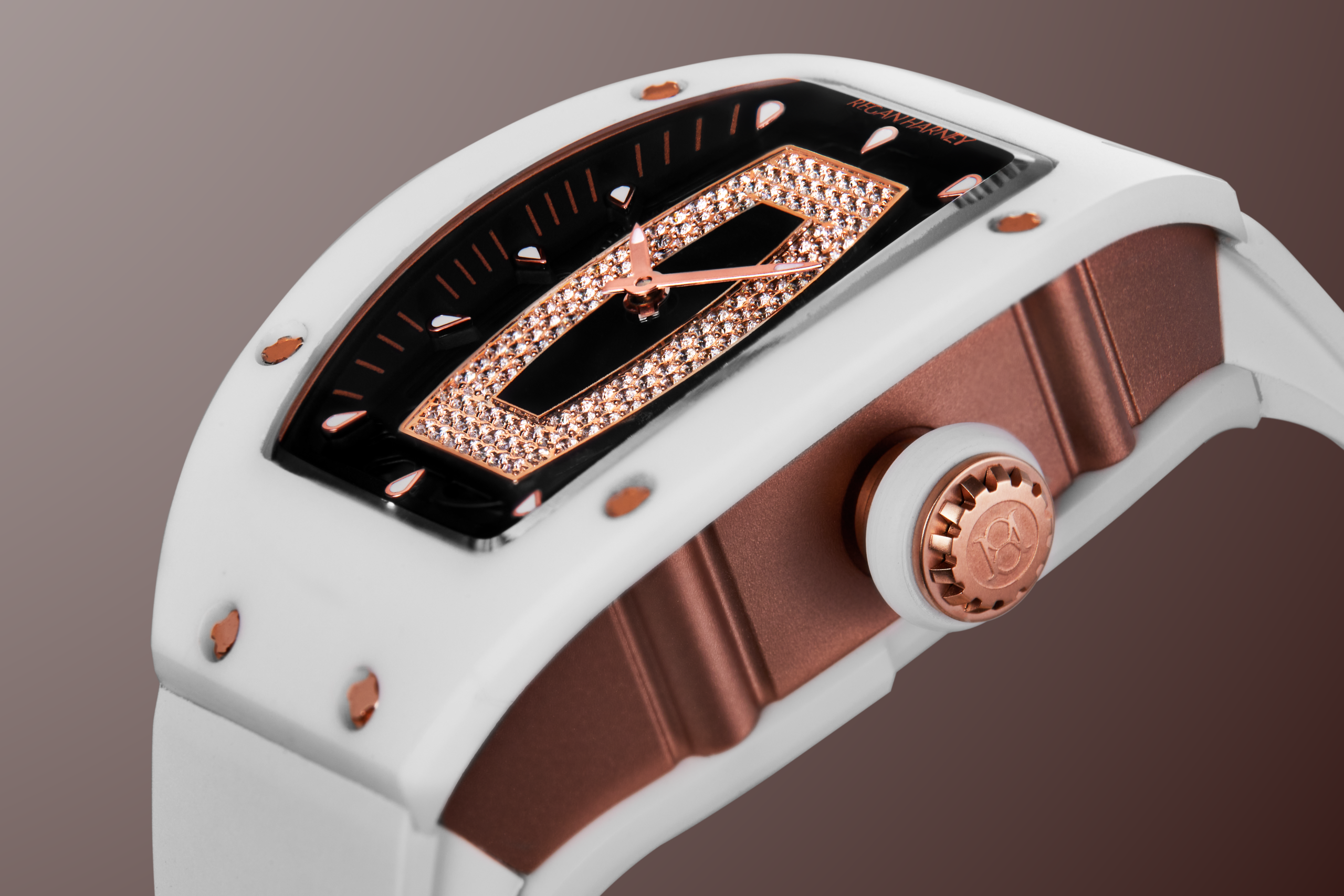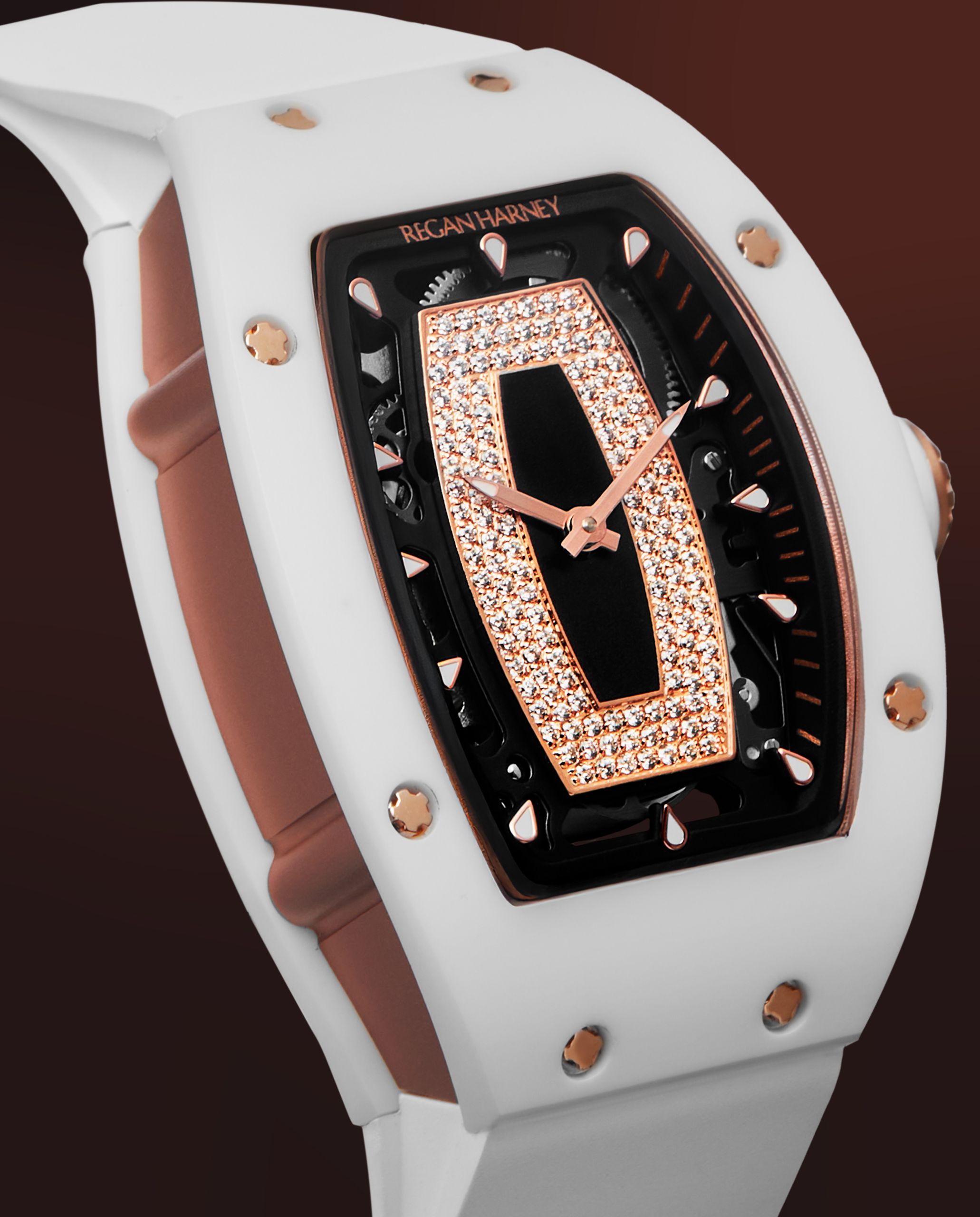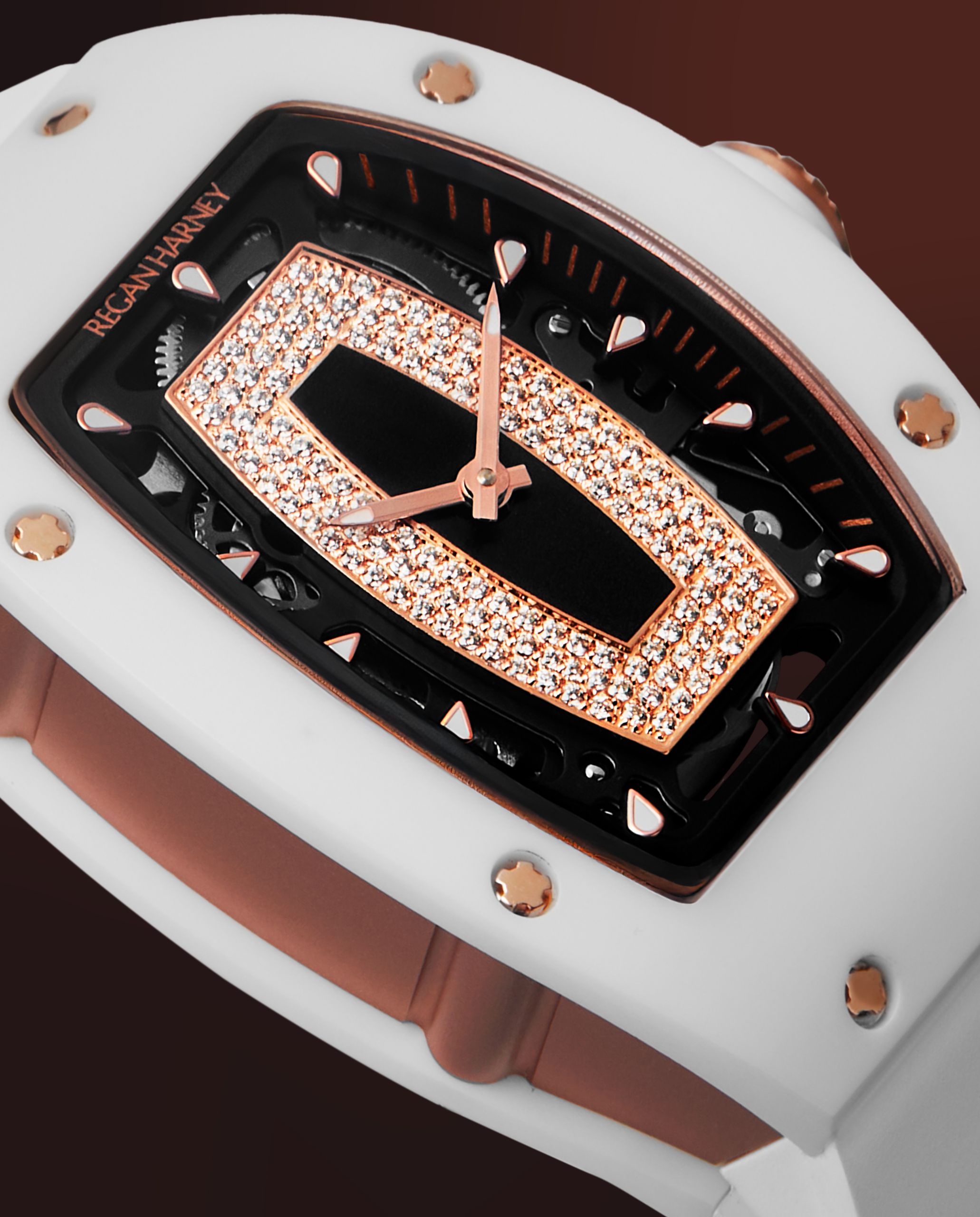 The RH32-11 “The Yang” features a serene and refined design with a pristine white ceramic case enhanced by crystal diamond accents. Powered by a reliable automatic movement, this timepiece combines precision performance with a comfortable vulcanized rubber strap and durable sapphire crystal protection—offering elegant everyday wear with a balanced and graceful aesthetic.